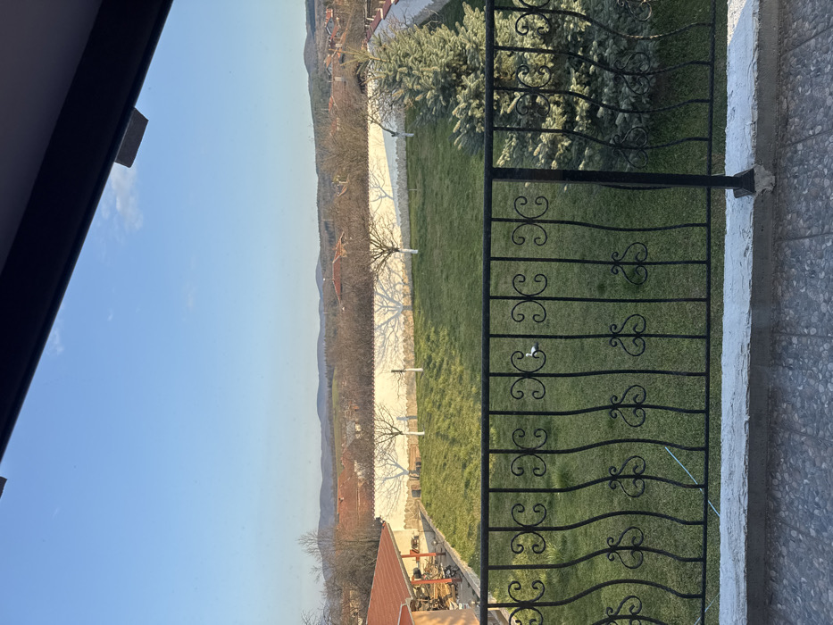 The image depicts a panoramic view of a residential area in Kanchevo, Bulgaria, observed from an elevated position, likely a balcony. In the immediate foreground, a dark, ornate wrought-iron railing with scrollwork is visible, set against a paved concrete balcony floor. The midground features a rectangular, well-maintained green lawn. A tall, white stone-faced wall forms the rear boundary of the lawn, behind which several whitewashed deciduous trees with bare branches are regularly spaced. These trees cast long shadows onto the wall and lawn, suggesting either early morning or late afternoon sun. To the right of the lawn, a dense, blue-green coniferous tree is prominent. To the left, part of a building with a reddish-orange tiled roof is visible, with construction materials and an open-sided structure adjacent to it. The background consists of numerous residential houses with predominantly reddish-brown tiled roofs, interspersed with bare trees. Rolling hills or low mountains delineate the distant horizon under a clear, light blue sky with minimal cloud cover. No individuals, actions, or interactions are observable.