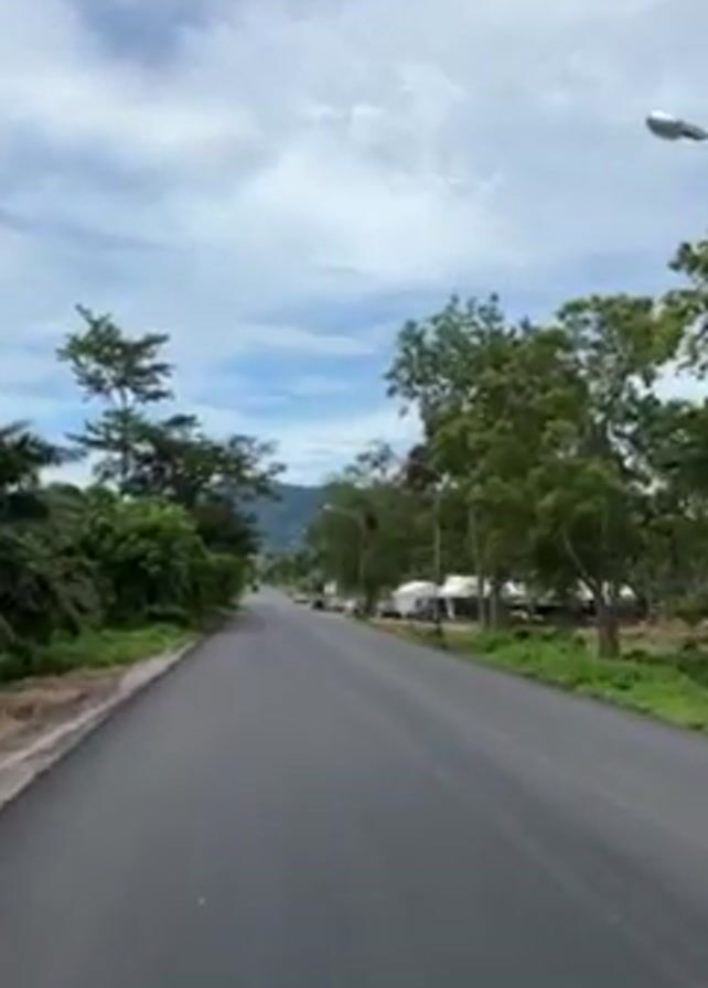 view from inside a moving vehicle, driving on an asphalt road. On either side of the road, there are trees, some appearing to be palm trees. In the distance, there are hints of mountains against a sky with scattered white clouds. On the right side of the road, there are parked vehicles, and what appears to be tents or covered areas. The scene has a somewhat bright and overcast feel.