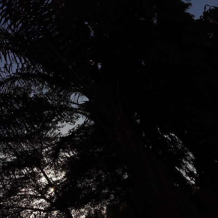 The image presents a densely forested or heavily treed outdoor scene in Narayi, Nigeria. Multiple large trees dominate the foreground, their foliage and trunks appearing as dark silhouettes against a lighter, bluish-grey sky, indicating conditions of either dawn, dusk, or strong backlighting. In the lower-left quadrant, a bright light source, consistent with the sun, is partially obscured by the dense canopy, creating a distinct sunburst effect. The visible trees include one with distinctive frond-like leaves on the left, possibly a palm, and others with a more general broadleaf appearance. No human figures, specific actions, or man-made objects are discernible within the frame; the scene consists solely of natural elements.