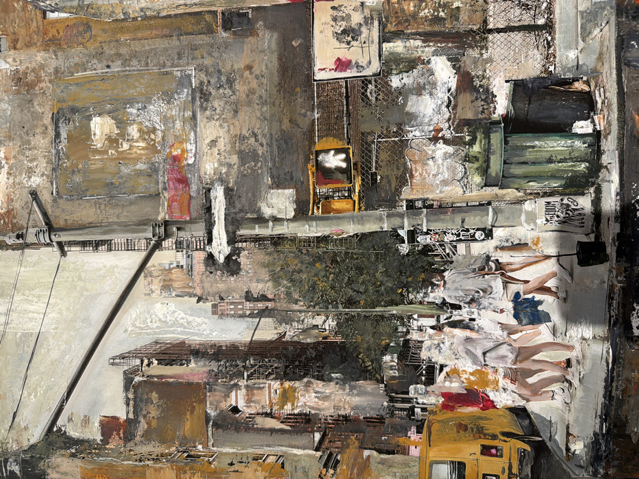 This heavily textured painting depicts a dense urban street scene, situated in the city of León, Mexico, as per instruction. The perspective is a medium shot looking down a busy street, with a prominent utility pole positioned slightly right of center in the foreground. **Environment:** The street surface in the immediate foreground appears dark and reflective, suggesting wetness. A light-colored sidewalk spans the midground. Tall, multi-story buildings with numerous fire escapes line both sides of the street, receding into the background under a hazy, light-toned sky. The buildings display a mix of browns, greys, and ochre, indicating weathered brickwork and concrete with signs of age and decay, including faded signage and abstract patches of color that suggest former advertisements or graffiti. Green foliage from trees is visible in the mid-background, breaking the urban hardscape. A chain-link fence, partially obscured and textured, runs along the right side from the midground to the foreground, adjacent to the utility pole. **Objects:** The central utility pole is dark grey, supporting a horizontal arm extending leftward. Attached to the pole are various street signs and a yellow pedestrian signal displaying a white "walk" symbol. Below the signal, two refuse bins, one dark green and cylindrical, the other a darker black square bin, rest on the sidewalk. On the left side of the street, in the midground, the rear of a yellow panel van is visible. The utility pole itself is covered in faint markings and stenciled text, including the word "FREEDOM" at its base. **People:** Approximately six to eight indistinct pedestrians are walking across or along the sidewalk in the midground, generally moving from left to right. Their figures are rendered with thick, light-colored brushstrokes, obscuring facial features and specific details, giving them a blurred or ghostly appearance. They wear casual clothing, including shorts and t-shirts. One individual towards the right carries a blue bag. **Actions/Interactions:** The primary action is the pedestrian movement across the street or along the sidewalk. No direct interactions between individuals are discernible. The scene conveys a sense of a routine urban moment with people traversing the street.