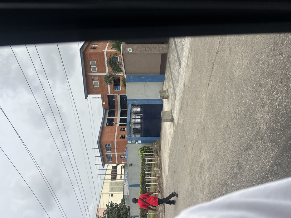 The image presents an overcast street scene in Ikeja, Nigeria. In the foreground, a gray asphalt road, exhibiting minor cracking, is visible. A blurred white object partially obscures the lower-left corner, and a dark vertical bar frames the right edge of the shot. Overhead, multiple thin, dark utility lines traverse the muted grey sky. One adult male, wearing a red short-sleeved shirt, dark trousers, and dark shoes, is walking from left to right across the paved road, away from the camera. A dark strap or bag is visible diagonally across his back. A multi-story building, constructed of reddish-brown bricks, dominates the background. It features numerous rectangular windows with white frames, some containing blue-tinted glass. The building has a flat roof with a light blue trim along its edges. A blue and grey perimeter wall, approximately 2 meters in height, separates the building from the street. This wall features a prominent double-leaf dark blue metal gate with an intricate top design. Two weathered, square concrete blocks rest on the asphalt directly in front of the gate. To the left of the gate, a low white metal fence encloses a small, grassy area. A small, white sign with the number "49" is affixed to the right pillar of the gate. Another, partially visible building, lighter in color and appearing industrial with visible vents, is situated further back on the left side of the frame. Palms and other greenery are visible behind the perimeter wall.