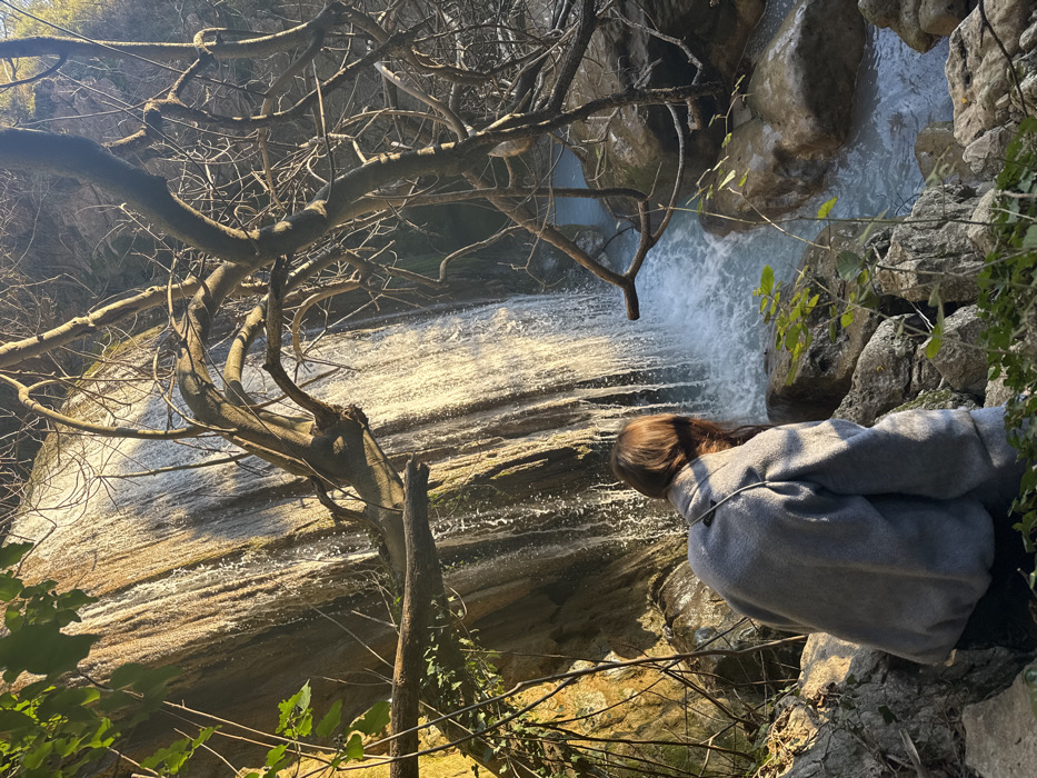 The image depicts an outdoor natural scene in the city of Krapina, Montenegro, centered around a cascading waterfall. A sole individual, a female with long, brown hair, is seen from behind in the lower left foreground. She is dressed in a light grey, oversized jacket, with a dark strap visible over her right shoulder. The individual is in a crouched position, looking towards the waterfall and the luminous blue water in the pool below. The waterfall itself occupies the middle ground, descending a tall, textured rock face. Bright sunlight illuminates the falling water, creating significant highlights. The scene is framed by numerous bare tree branches and rocky terrain, with sparse green foliage evident on the left and lower right.