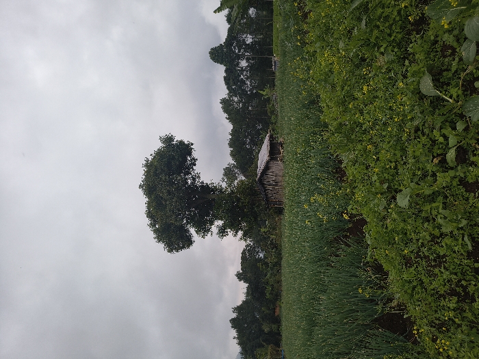 The scene, set in An Khe Ward, Vietnam, depicts an agricultural field under an overcast, grey sky. The foreground features rows of green, stalk-like crops, consistent with green onions or leeks, adjacent to a section of leafy green plants interspersed with small yellow flowers. In the midground, a large, dark green tree with a dense, rounded canopy stands prominently. To the right and slightly behind this tree, a small, weathered wooden shack with a corrugated metal roof is partially visible. A dense treeline borders the far background. No individuals, animals, or active interactions are present within the frame.