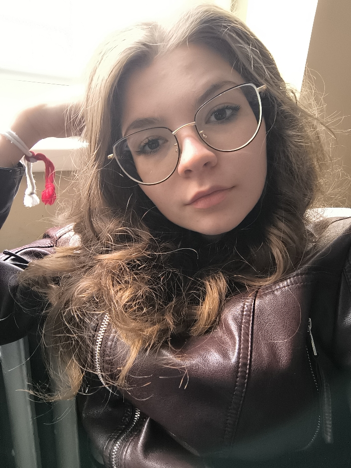 The image displays a close-up, frontal portrait of a single female individual in an indoor setting. The subject, a young adult with light complexion, possesses dark eyes, prominent eyelashes, and a neutral facial expression with closed lips. Her hair is long, wavy, and brown with lighter highlights, flowing over her shoulders and chest. She wears cat-eye style eyeglasses with gold-colored metal frames and a thin dark upper rim. Her attire consists of a dark, possibly burgundy or brown, leather-like jacket featuring a prominent silver zipper on the front, over a dark high-neck garment. On her left wrist, a multi-strand bracelet or wristband fashioned from white and red cords, with knotted ends, is visible. Her left hand is raised and positioned behind her head, partially obscured by her hair. The background is brightly lit, out of focus, and indistinct, appearing as a light, uniform color, preventing any specific environmental or architectural features from being identified. The precise location within the city of Pernik, Bulgaria, is not discernible from the visual content of the image. No interactions with other individuals or objects, beyond the self-pose, are evident.