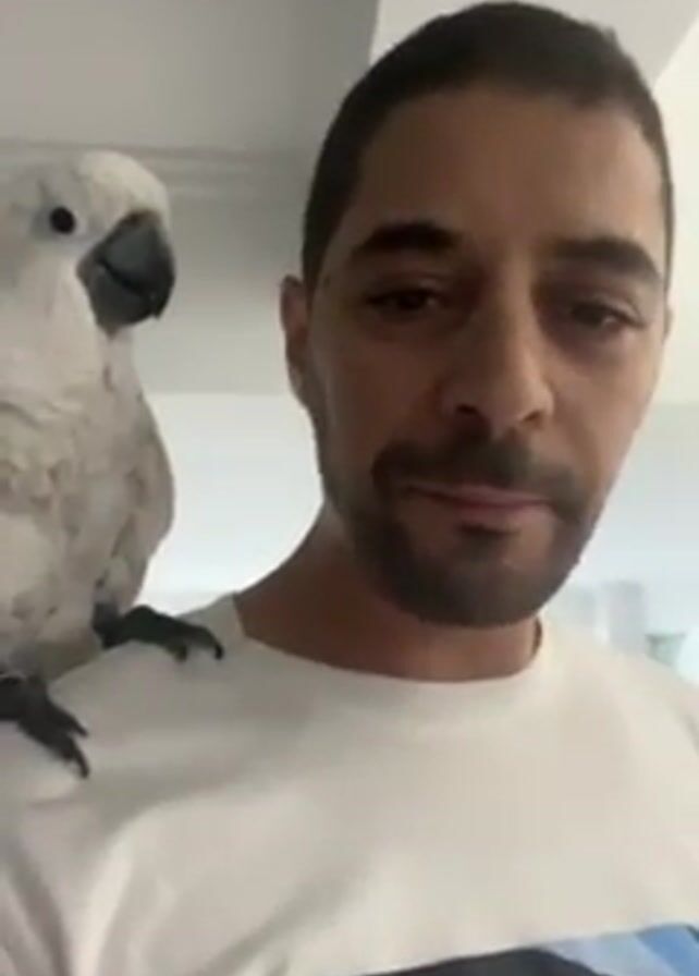 A person with dark hair and a beard is standing indoors. The person is wearing a white t-shirt with blue and white abstract shapes. A white cockatoo with grey tinges is perched on the person's left shoulder. The person says "Cookie" to the bird. The background is a plain white ceiling and wall.