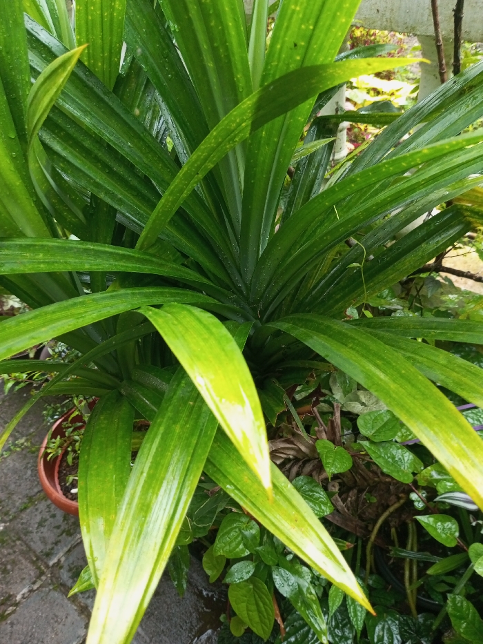A lush pandan plant dominates the scene, its long, vibrant green leaves radiating outwards. The leaves are glossy, with visible water droplets, suggesting recent rain. Some leaves exhibit yellowing at the edges and tips. A terracotta pot is visible at the base of one plant. Surrounding the pandan are smaller, leafy plants, creating a dense, green background. The ground appears damp, with paving stones slightly visible on the side.