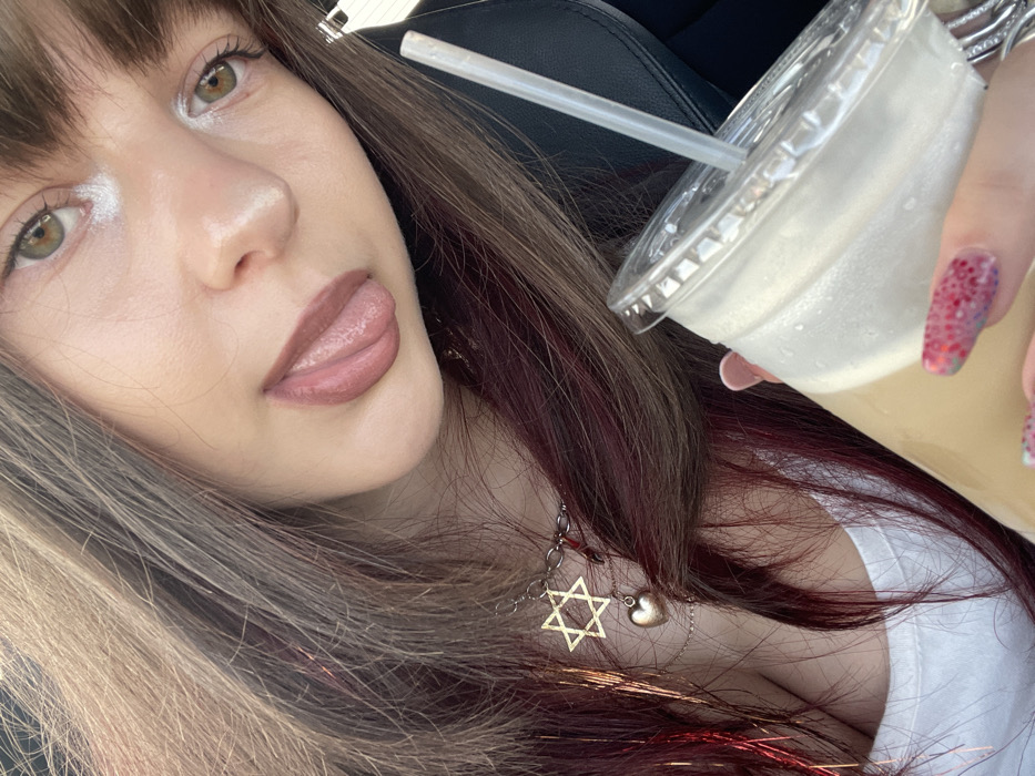 An overhead close-up portrait features a female individual positioned within what appears to be a vehicle interior. Her long, multi-toned hair, displaying shades of brown and prominent reddish-purple streaks, frames her face. Bangs partially cover her forehead. Her eyes are hazel, and her facial makeup includes white eyeliner or eyeshadow on the inner corners and lower lash line. Her lips are covered in a brownish-pink lipstick, and her tongue is extended. She is wearing a white garment, likely a top or t-shirt. Around her neck, a silver-colored necklace is visible, from which a gold-colored Star of David pendant and a smaller gold-colored heart pendant hang. Small red beads are also present on the necklace chain. Her right hand, adorned with rings, holds a clear plastic cup containing a light brown, foamy beverage. The cup has condensation on its exterior and contains a transparent straw. Her fingernails are long, almond-shaped, and decorated with a multi-colored glitter design, primarily red speckles. Soft, natural light illuminates the subject from the left side.