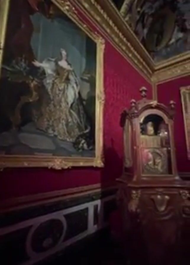 n ornate room, likely in a palace or historic building. Walls are covered in red fabric with gold detailing, and paintings in ornate frames hang on the walls. The camera pans from a large portrait of a woman in a gown, to a tall clock with wooden embellishments, to the full view of the room. There is a canopied bed with red curtains and matching footstools. The ceiling has painted artwork, and a chandelier hangs near the bed. The room is dimly lit. There is no audio other than an infant crying.
