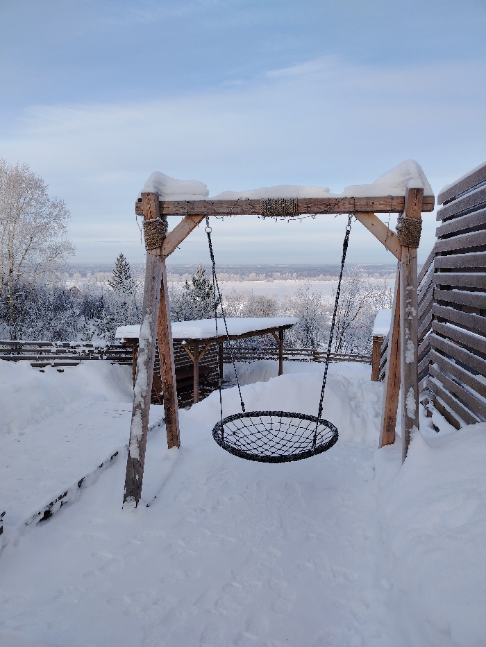 A winter scene shows a circular swing hanging from a wooden frame, both covered in snow. The ground is blanketed in thick snow, with wooden planks partially visible. A covered structure sits further back, also laden with snow. Bare trees and a distant landscape are visible in the background, under a pale blue sky. A weathered wooden fence borders the scene to the right.