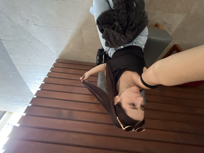 A woman stands by a wooden structure. She wears a black top, light blue jeans, and sunglasses resting on her head. A dark, fuzzy jacket is draped around her waist. Her long, dark hair flows past her shoulder, and she appears to be holding a strand of it. The background includes a textured, light-colored wall and a glimpse of a gray seat.