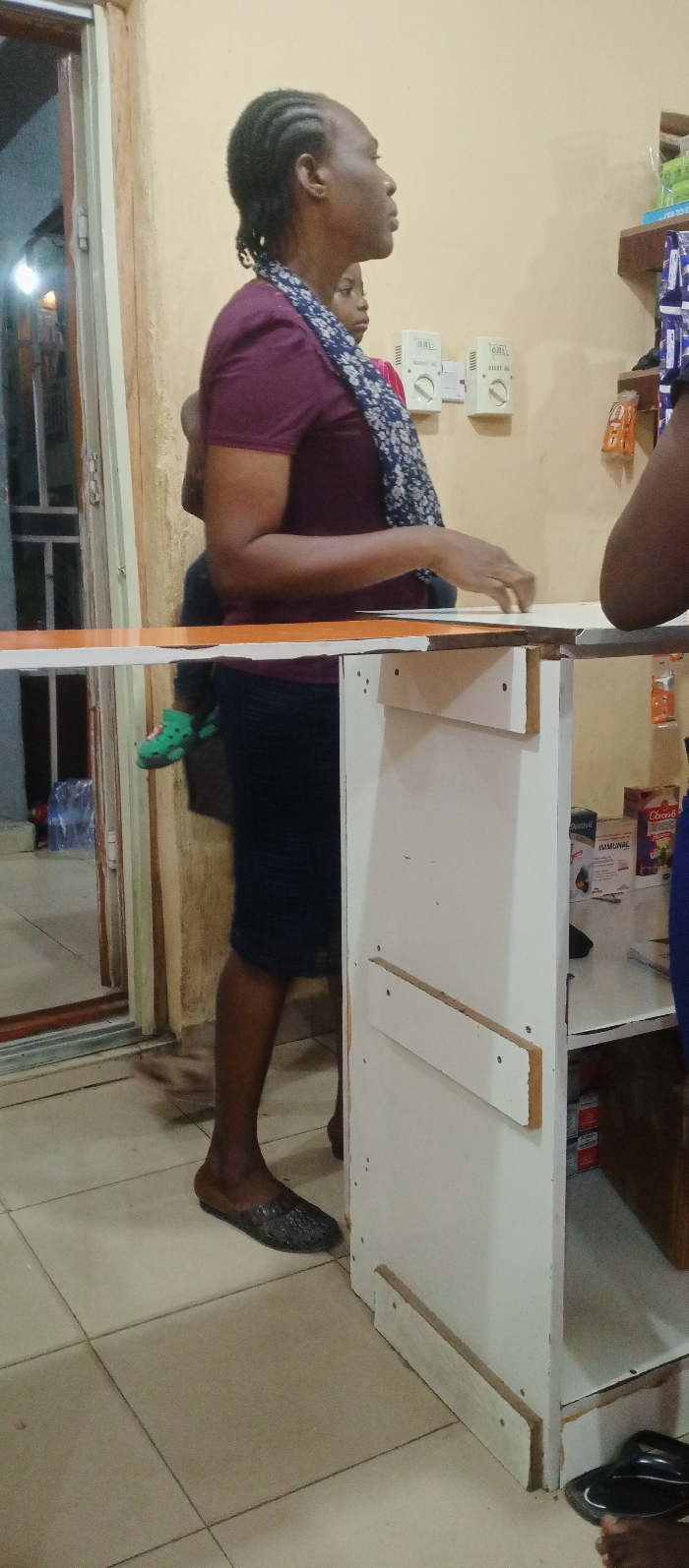 The image displays an indoor scene within a commercial establishment in Lokoja, Nigeria. An adult woman with dark skin and braided hair, wearing a maroon short-sleeved top, a dark blue skirt, and a blue-and-white patterned scarf, stands to the left of the frame. Her left hand rests on the light-colored, orange-topped counter in front of her. She is observed looking to her right, beyond the frame. A child's head is partially visible behind her, and a small child's leg, wearing a green shoe, is seen further back near a doorway. On the far right, the arm and torso of another individual are partially visible behind the counter. The background wall is painted a light beige. Two white electrical control units with circular knobs are mounted on the wall. Behind the counter, shelves hold various packaged goods, including boxes labeled "Immunal" and "Obron-6". The floor is covered with light-colored square tiles. To the left, an open wooden doorway leads to a dimly lit area where a clear plastic water dispenser bottle is visible on the floor.