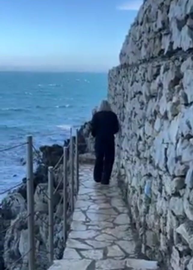 A woman in a black outfit walks on a stone pathway next to the ocean. To her right is a high, pale gray stone wall. To her left is the ocean, with a low fence and rocky shoreline. The ocean waves crash gently on the rocks. The sky is light blue. The woman turns toward the camera, looks at it briefly, and then turns away.