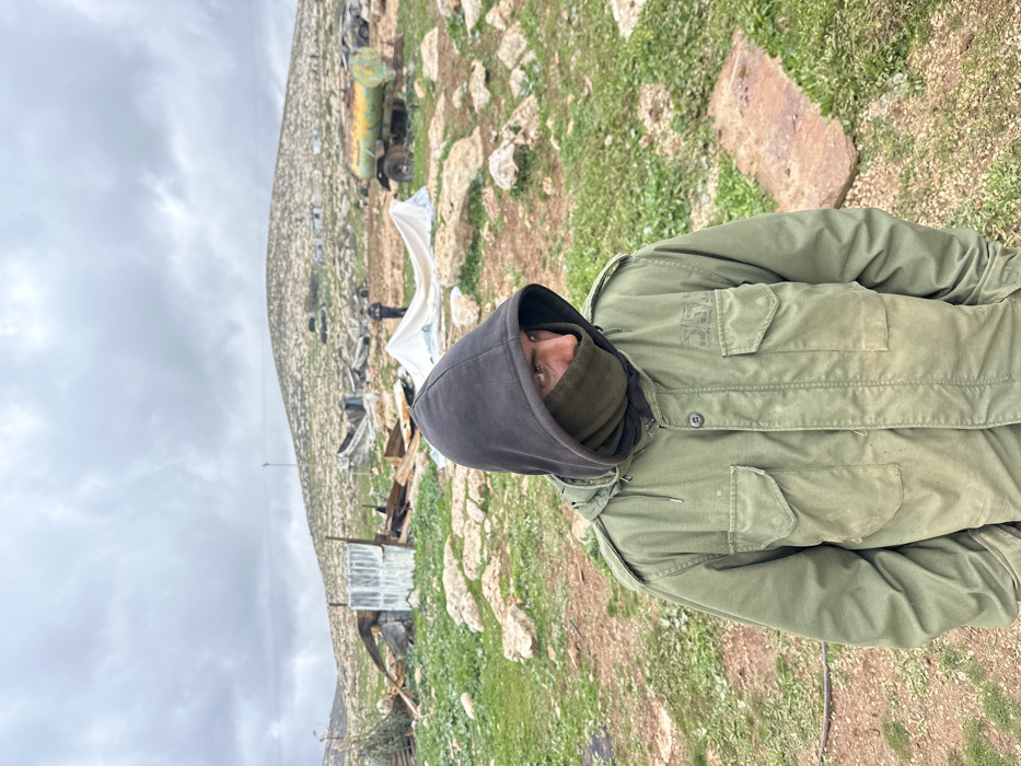 The image, taken in Mikhmas Bedouin, Palestinian Territory, features a male subject in the foreground set against a desolate, rocky landscape under an overcast sky