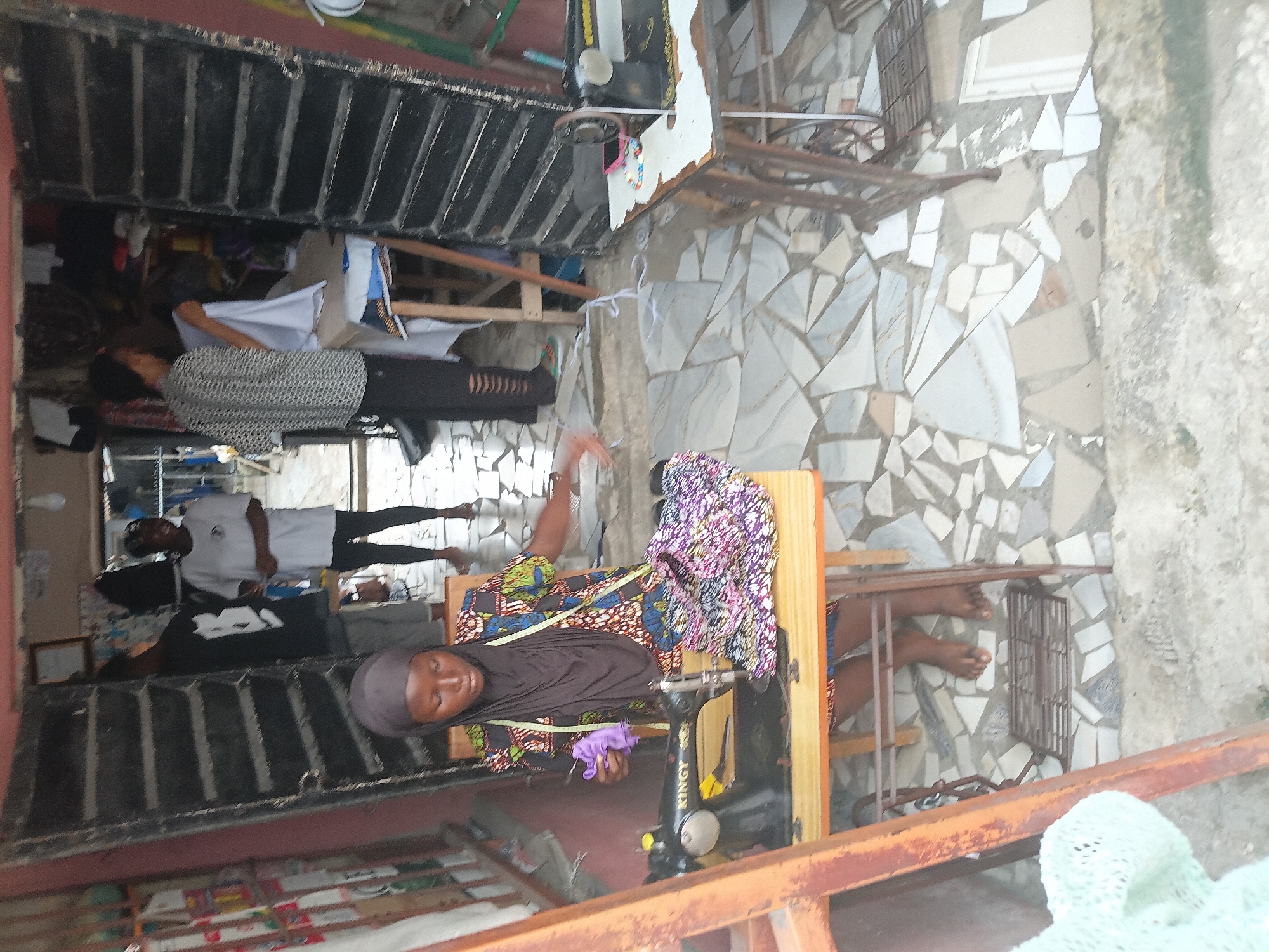 The scene depicts the open entrance of a tailoring shop or textile workshop in Ado, Nigeria. In the foreground, a young, dark-skinned woman, barefoot, is seated on a wooden stool operating a black "KINGY" brand sewing machine. She wears a brown hijab and a vibrant multi-colored patterned short-sleeved top, with a yellow measuring tape draped around her neck. Her hands are engaged with a piece of purple fabric and another patterned fabric on the machine's bed. Inside the shop, beyond the woman, three other individuals are present. To the right background, a person in a black patterned shirt and dark pants with horizontal rips stands at a table, handling a piece of white fabric. Further back and slightly to the left, another person in a white t-shirt and dark leggings stands, also barefoot. A third person, wearing a black t-shirt with a white "B" graphic, is partially visible in the far left background. The entrance consists of two open dark louvered metal doors. The floor inside and directly outside the shop is covered with an irregular mosaic of light-colored broken tiles (white, gray, beige). Another vintage-style sewing machine with a metal treadle stand and a wooden top, holding colorful beads and a pink accessory, is positioned on the right side of the shop. A rusty reddish-brown metal frame is partially visible on the far left foreground, with a light green crocheted item hanging from it. The environment is brightly lit, indicative of daytime.