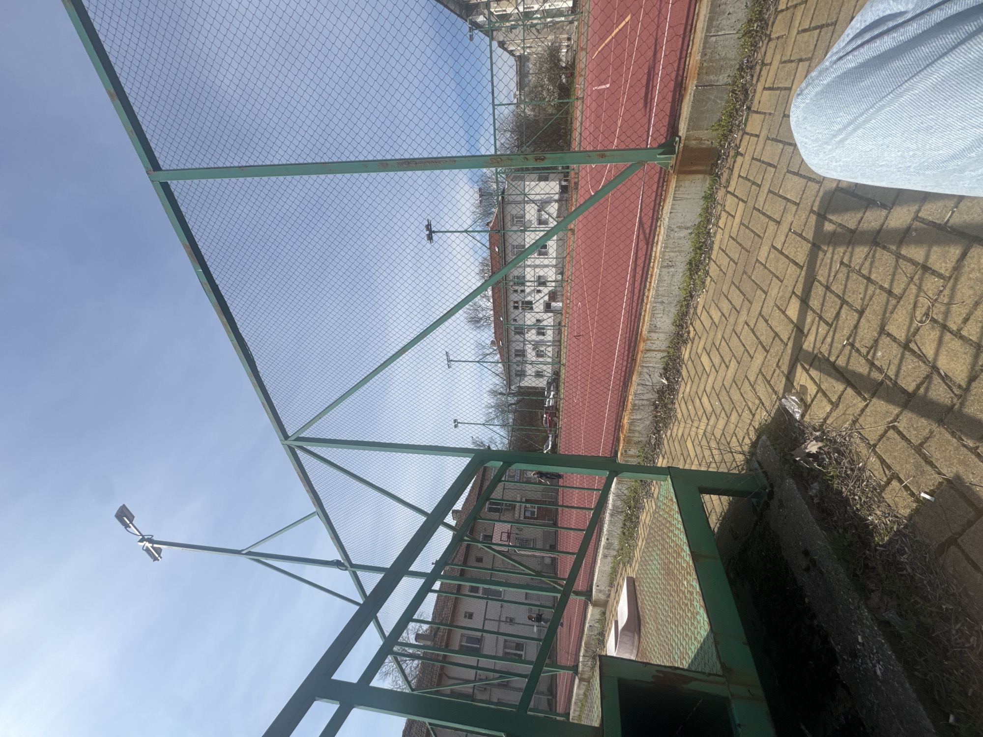 track and field area in Dimitrovgrad, Bulgaria, seen through a green metal fence. A red running track is visible, bordered by a concrete curb and overgrown vegetation. Beyond the track, there's a building with multiple windows. The sky is partly cloudy. The foreground includes a section of brick pavement and some overgrown weeds. A person wearing light blue clothing is partially visible. A light pole is attached to the fence structure. The scene is outdoors and appears to be in daylight.