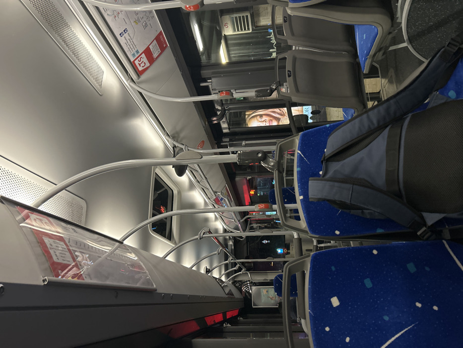 The interior of a bus is seen, with rows of blue patterned seats and grey headrests. A blue and grey backpack is placed on one seat. Handrails run along the ceiling. Windows show glimpses of the outside. Overhead displays are visible. Red lights run along the aisle floor. The general ambiance appears to be dimly lit.