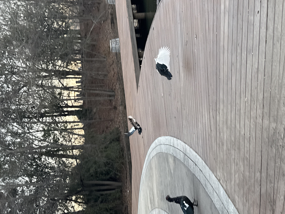 A slightly angled view captures a wooden boardwalk with several Muscovy ducks. One duck stands on a circular platform, while another takes flight nearby. Further up the boardwalk, another duck soars with its wings fully extended. The background shows a dense forest of bare trees under an overcast sky.