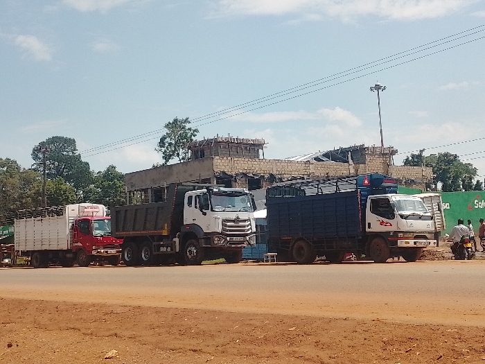 The image depicts a daytime outdoor scene in Chevaywa ward, Kenya. A paved asphalt road runs horizontally through the mid-ground, with a wide dirt shoulder in the immediate foreground. Three commercial trucks are parked parallel to the road on the right side, facing generally rightward. From left to right: 1. A red-cab truck with a white flatbed body featuring side rails, loaded with multiple bundles of dark, cylindrical objects, likely metal rods or pipes. 2. A white-cab dump truck, possibly a Dongfeng brand, with a dark grey or black dump body. 3. A white-cab box truck, possibly a Fuso, with a dark blue enclosed cargo body topped with a metal frame. A blue plastic tank is mounted above its cab. Behind the trucks, a multi-story building is under construction, displaying exposed concrete and masonry on lower levels and wooden formwork and scaffolding on upper sections. Further to the right and behind the construction, a large green billboard with white "Safaricom" branding is visible. A tall utility mast with multiple light fixtures extends skyward in the background. To the far right, near the third truck and the billboard, a motorcycle (boda-boda) is present, with at least one individual seated on it and additional people standing nearby. Overhead power lines traverse the upper portion of the frame. The background features a mix of sparse vegetation and distant trees under a partly cloudy sky.