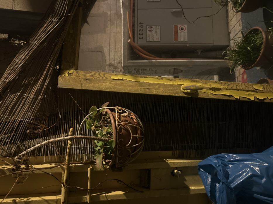 An outdoor scene shows a potted plant in a decorative spherical cage, sitting on a yellow shelf. Behind the shelf is a dark, slatted background, partially obscured by the cage. A weathered wooden structure with peeling yellow paint is above the shelf. To the upper right is a gray electrical panel mounted on a wall. A crumpled blue tarp is visible on the lower right, adding a contrasting color and texture to the scene.