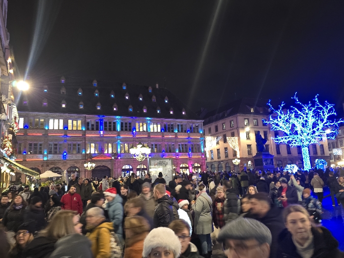 A crowded scene at night features illuminated buildings with red and blue lights. A large tree covered in blue lights stands out on the right. People are bundled up in winter clothing, with some wearing hats. The scene is bustling with activity, suggesting a festive event or gathering. Streetlights add to the overall brightness of the scene.