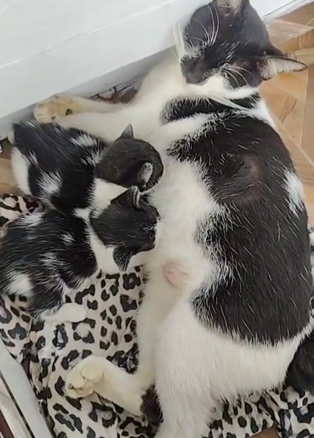 - "A black and white cat is lying down on a leopard print blanket, nursing her three kittens" by FM-Fz47q1, licensed under CC BY 4.0