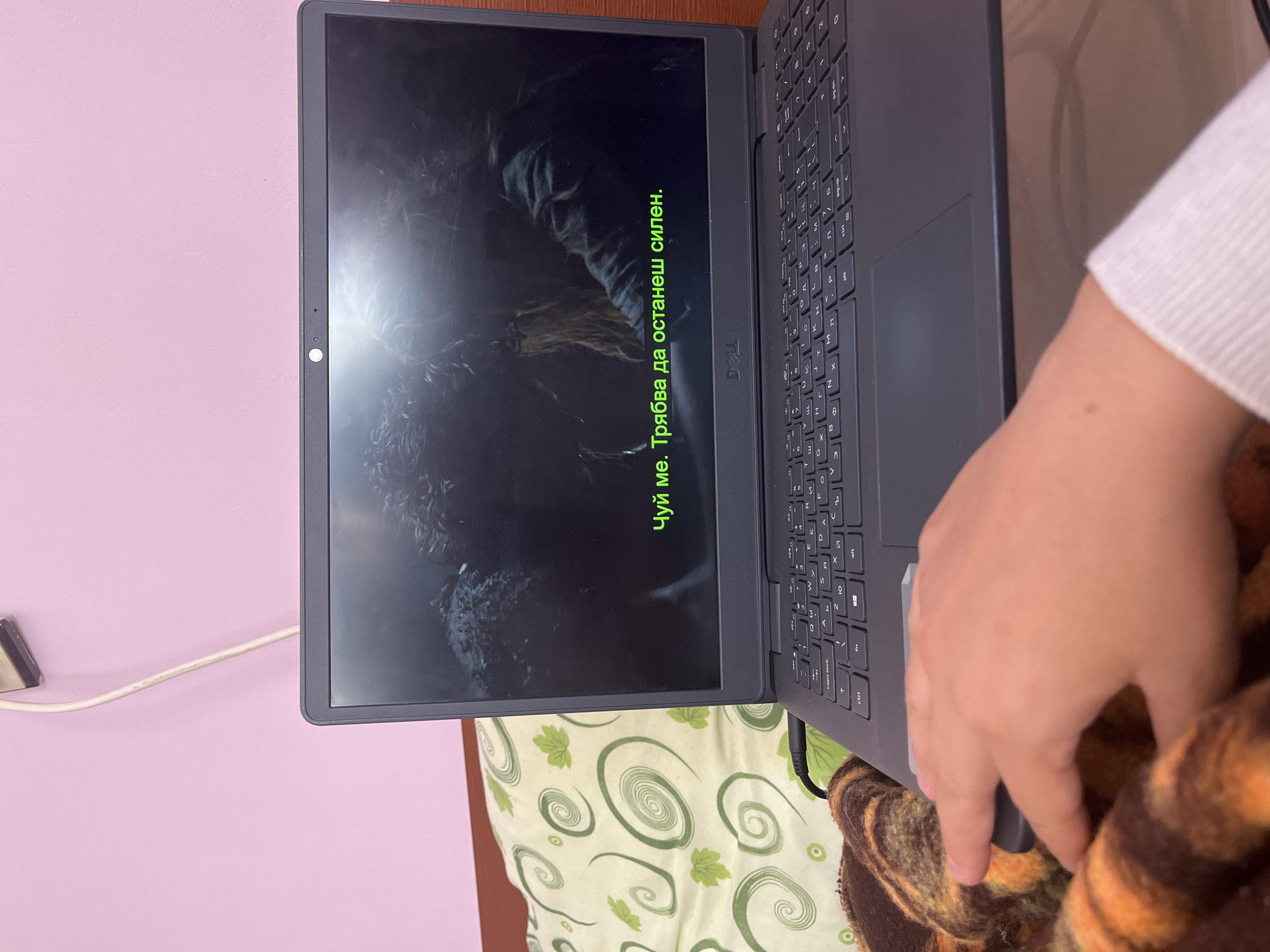 An indoor scene in Shishmanovo, Bulgaria, depicts a person engaging with a dark grey Dell laptop. The laptop is open, displaying a dark-toned video scene featuring two indistinct figures and green Cyrillic subtitles that read: "Чуй ме. Трябва да останеш силен." (translating to "Hear me. You must stay strong."). The screen exhibits reflections and minor surface marks. A small webcam and indicator light are visible at the top center of the screen bezel. A fair-skinned right hand is positioned to the left of the laptop's touchpad, operating a dark grey external computer mouse. The hand and the mouse rest on a brown and orange patterned blanket, likely plaid. A portion of a white long-sleeved garment is visible on the person's forearm in the lower right corner. The immediate background to the left of the laptop includes a pillow with a light green base featuring a repeating pattern of darker green swirls and stylized leaves. Behind the pillow, a brown wooden edge, possibly a headboard, is visible. The dominant background element is a solid light pink wall. A white electrical cable extends vertically upwards along this wall from the left side of the frame, connecting to an object not fully visible at the top edge.