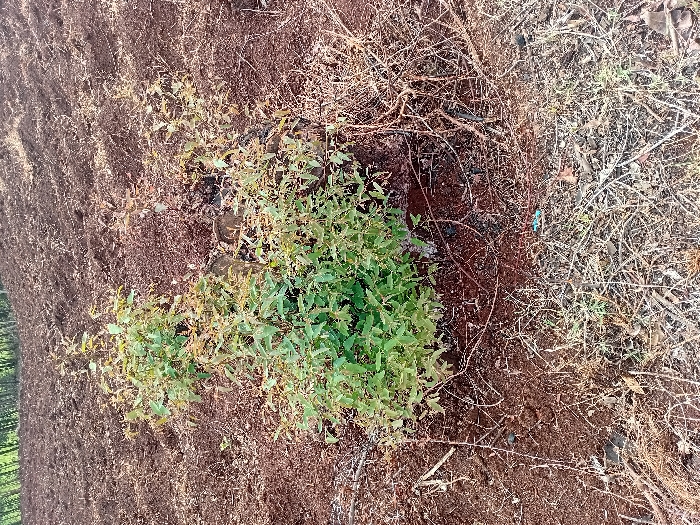 The image displays an agricultural scene in Ndeiya, Kenya. In the central foreground, a cluster of three young, green-leafed saplings or shrubs, approximately 0.5 meters tall, grows from dark reddish-brown soil. The surrounding ground is tilled and disturbed, characterized by irregular patterns and small mounds of earth. Scattered across the lower half of the frame are dry organic materials, including dead grass, twigs, and plant debris. A small, light blue plastic fragment is visible on the soil surface in the lower right quadrant. The background shows an uphill slope of similarly tilled reddish-brown earth, culminating in a dense line of mature green trees on the horizon. No people, actions, or interactions are visible.