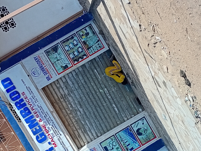 The scene depicts an outdoor commercial area in Gandu Albasa, Kano, Nigeria, specifically the storefront of "MR. GEMBROID MACHINE & SERVICES" located at Rakada Phase 1, Kwanar Freedom Opp. Aliko Filling Station. The building features a blue and white facade with a closed gray metal roller shutter securing the entrance. Promotional posters displaying embroidery machines and services are affixed to the facade on either side of the shutter. A single individual, dressed in a yellow long-sleeved shirt and yellow pants with red stripes, is observed lying prostrate on the light-colored tiled pavement directly in front of the closed shutter. Their head is positioned near the ground, facing away from the camera, with their body curled. The paved area transitions to a light brown dirt patch in the foreground and to the right, with scattered small debris visible on both surfaces. An adjacent building with patterned ventilation blocks is partially visible to the right of the storefront.