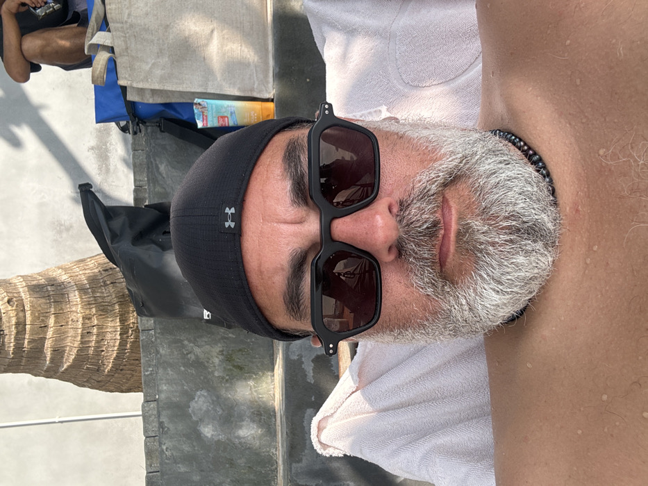 A fair-skinned adult male is depicted in a close-up, head-and-shoulders view, appearing to rest outdoors in the city of Unknown, Unknown. He has a prominent grey and white beard and mustache, wears a black Under Armour baseball cap, black rectangular sunglasses, and a dark beaded necklace. Small water droplets are visible on his skin. He is positioned against a white towel. In the background, on rough-textured concrete steps, a segment of a palm tree trunk is visible on the left. Various objects are placed on the steps, including a black dry bag, a blue tote bag, a beige tote bag, a yellow bottle, and a partially obscured green and white package. The lower torso and legs of a second, seated individual are visible in the upper right quadrant of the image. The scene is illuminated by strong, natural daylight, creating distinct shadows.