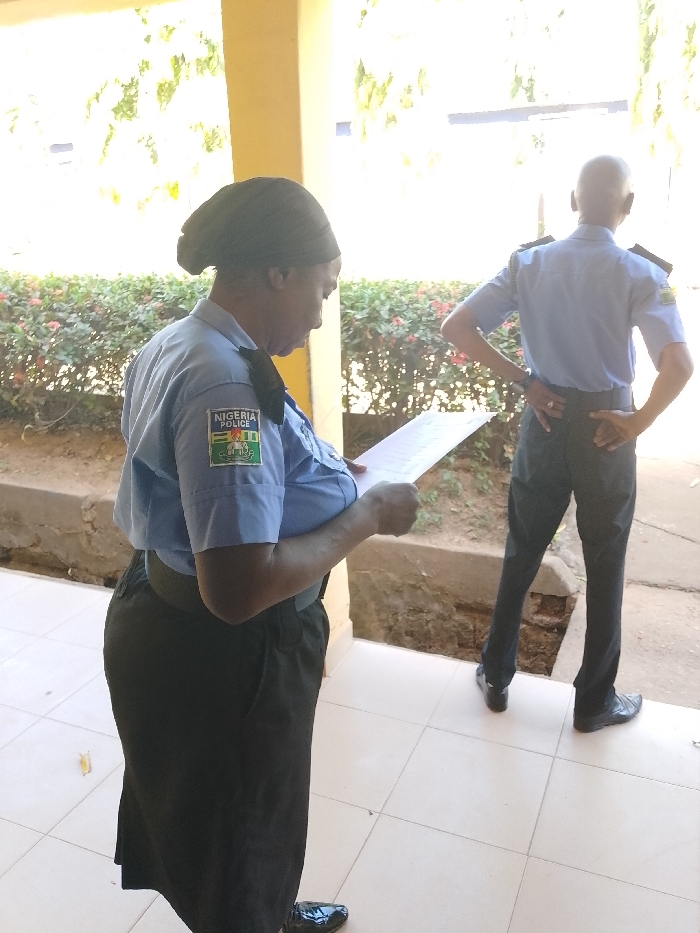This image depicts two uniformed Nigeria Police Force officers at an unspecified location within Kabala, Nigeria, during daylight hours