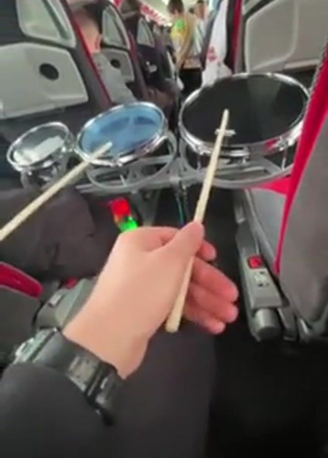 person playing a small drum set on a bus. The drum set consists of three drums of varying sizes. The person is holding drumsticks and striking the drums. The bus is full of passengers, and the seats are red and gray. The person is wearing a black shirt and a watch. The drum set is positioned between two seats, partially blocking the aisle.