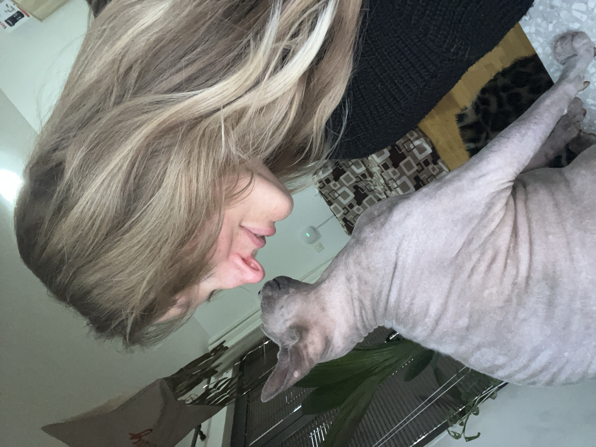 This image depicts an intimate indoor scene within a private residence in Budva, Montenegro. An adult female, partially visible on the right, with long blonde hair and wearing a dark, possibly black, knitted garment, is positioned with her head tilted down. She is engaged in close interaction with a light-skinned Sphynx cat, whose head is tilted upwards. Their noses are in near contact, indicating a close or affectionate interaction. In the background to the left, a window with horizontal blinds is partially visible, in front of which stands a large green plant. Above the plant, a light-colored fabric object with dark markings hangs. The background to the right displays a white wall with a small, glowing green indicator light mounted on it, and a section of brown and beige geometrically patterned fabric. Below these, a wooden floor is visible, along with a dark, patterned fabric, possibly a leopard-print blanket or rug. The foreground features a light-colored, speckled surface, likely a table or counter, supporting the Sphynx cat's front paws.