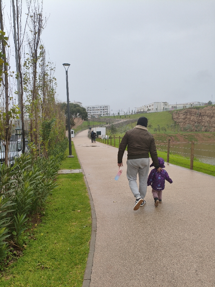A person and a small child stroll along a paved path. The child wears a purple coat and matching hat. To their left, there's a green lawn, a line of young trees, and a lamppost. On the right, a grassy area slopes down to a body of water with a wooden fence. Further away, buildings sit on a grassy hill under a cloudy sky. Another person walks in the distance. The taller person carries a colorful bottle.