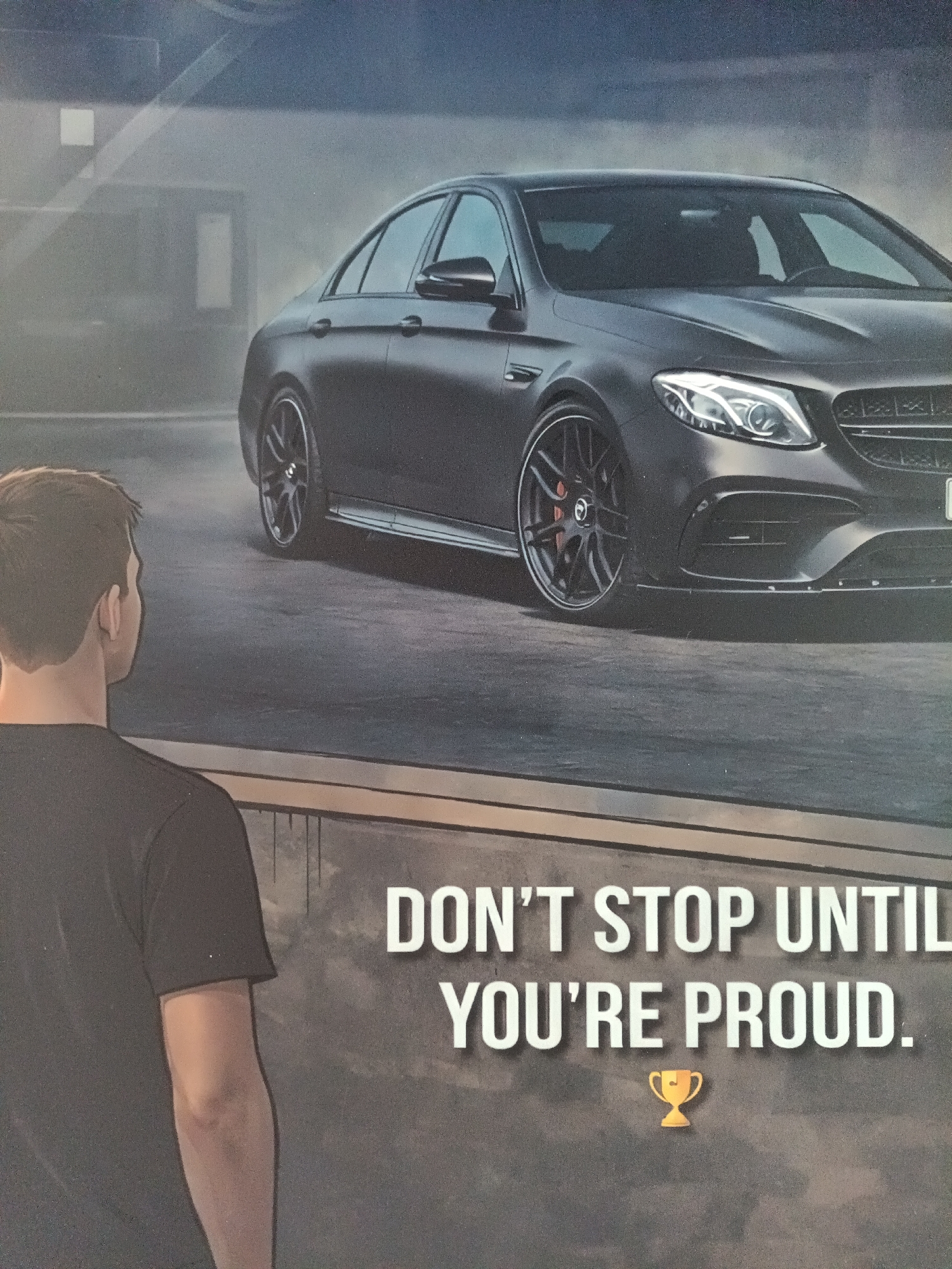 A poster depicting a dark grey Mercedes-Benz E63 AMG sedan is displayed. A man with short brown hair, wearing a black t-shirt, is depicted from the back, looking at the car. Below the car, the words "DON'T STOP UNTIL YOU'RE PROUD" are written in white, with a golden trophy icon beneath the text. The background of the scene is urban, with a large, dark building. The location is not Mramor, Bulgaria.