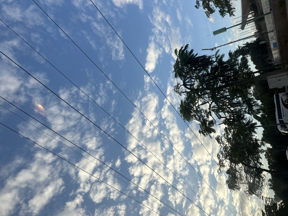 A low-angle shot captures a partly cloudy sky crossed by several black power lines. Wispy clouds create a textured backdrop against the blue. To the right, trees line the street, their branches silhouetted. A tall, slender pole rises above the trees, and a vehicle is partially visible at the far right edge of the frame, indicating an urban or suburban setting.