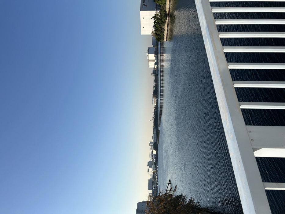A waterway stretches between buildings along its bank, receding into the distance. The scene is viewed from a high vantage point, with part of a white railing visible on the right. The sky is a gradient of blue and yellow. A treeline follows the buildings along the edge of the water.