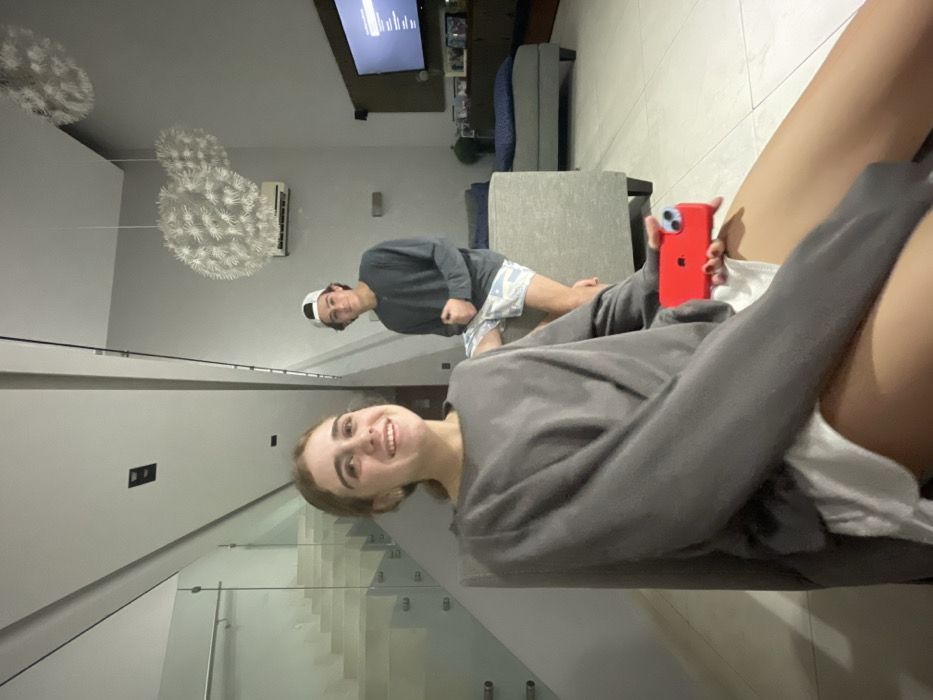 Two people, one female and one male, pose for a photo. The female is in the foreground, smiling and wearing a grey sweatshirt. The male is in the background, wearing a grey sweatshirt and white patterned shorts. A red phone is visible in the hands of the female, suggesting she is taking the photo. The setting appears to be inside a modern house, with stairs and glass railings in the foreground and a living room area in the background. A large television and decorative lighting fixtures are visible.