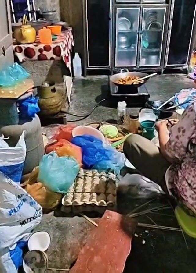 busy kitchen scene. In the background, a person is cooking something in a frying pan on a stove. Several kitchen cabinets stand behind the cook, filled with plates and glasses. In the foreground, there is a disorganized pile of items on the floor. These include plastic bags in various colors (red, blue, orange, and turquoise), a carton of eggs, vegetables (such as cabbage and carrots), spices in glass jars, and a halved coconut. A green gas cylinder is positioned near the stove. A person is sitting on a green chair, partially visible in the right corner of the frame. The floor is concrete and appears somewhat dirty.