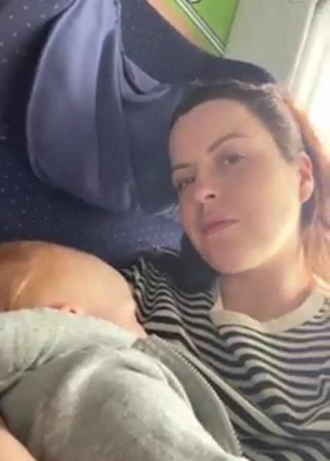 A woman is sitting on what appears to be a train, holding a sleeping baby