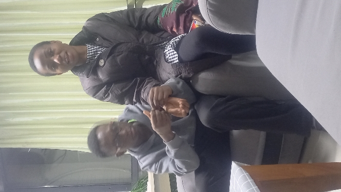 Two individuals are seated on a grey upholstered couch indoors