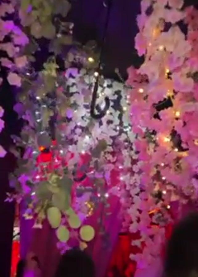 n interior space, possibly a bar or club, decorated with floral arrangements. Initially, the camera focuses on two clusters of artificial flowers in white and pink hues, adorned with tiny lights, hanging from the ceiling or an overhead structure. An umbrella hangs among the foliage. People can be seen standing in the background, partially obscured by the floral decorations. The camera then pans upward to reveal the ceiling, featuring concentric illuminated circles of light. The overall ambiance suggests a festive or party atmosphere, enhanced by the colorful lighting and the presence of people enjoying themselves.