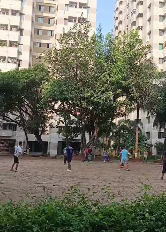 In an outdoor dirt field surrounded by trees and lush green bushes, a group of boys and young men are engaged in a game of soccer. Tall apartment buildings rise in the background, their multiple stories of windows framing the scene. The players are scattered across the field, kicking and chasing after the soccer ball. Some are wearing jerseys in different colors, including red, blue, and white. The sky is bright and slightly overcast, suggesting a clear day.