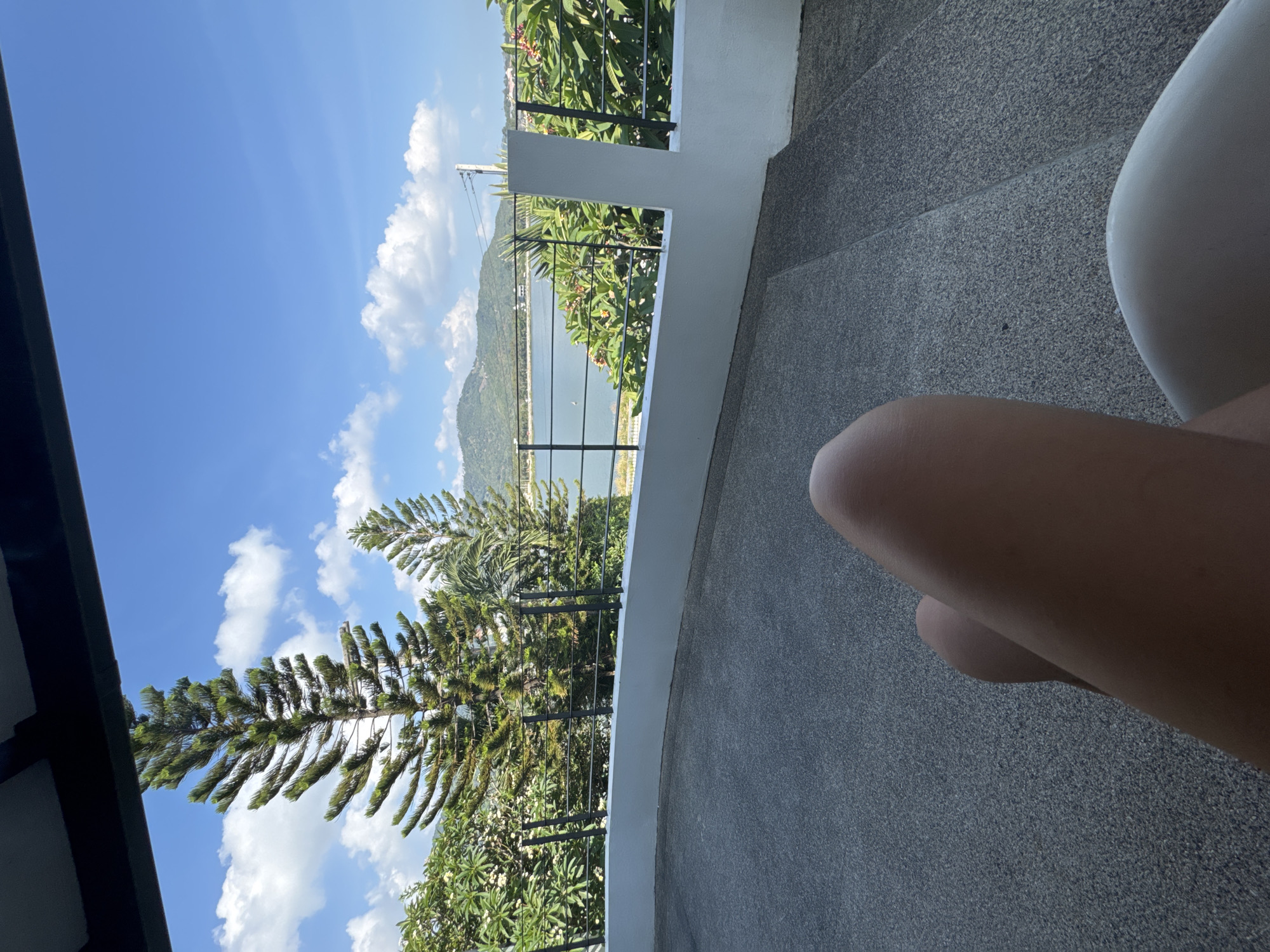 The image presents an outdoor, high-angle perspective from what appears to be a balcony or terrace in Baan Chaweng, Thailand, under a clear, sunny sky. In the immediate foreground, two bare, light-toned human legs, appearing crossed or angled, occupy the lower right quadrant of the frame. These legs rest on a dark grey, speckled aggregate floor. A low, curved white concrete wall acts as a barrier, topped by a black metal railing with multiple horizontal bars, extending across the mid-ground. Behind this railing, dense tropical vegetation is visible, including two tall, slender conifer-like trees and various green shrubs, some bearing sparse white and reddish-orange flowers. Beyond the vegetation, a calm body of blue-green water, likely Chaweng Lake, stretches towards the horizon, with a small, indistinct white object visible on its surface to the left. The far shore features a line of scattered buildings and more greenery. A prominent, tree-covered mountain range forms the distant background. The sky above is bright blue with scattered white cumulus clouds. A light-colored utility pole with associated dark power lines is present on the right side, extending over the water.
