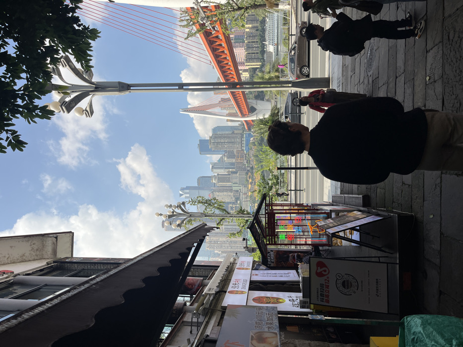 The scene depicts an urban street view in Nan'an District, China, under a bright blue sky with scattered white clouds. The immediate foreground features a stone-paved sidewalk partially shaded by a building with a dark, scalloped awning on the left. Commercial signs with Chinese characters are visible on the building, including one red sign with "ZHANGBEI" and a white sign displaying a QR code for payment. A street stall with a traditional dark roof and internal neon lights is positioned next to the building. In the foreground-right, a male individual, seen from behind, wears a dark long-sleeved shirt and light trousers, looking towards the street and distant city. To his right, another male with a dark backpack is partially visible, appearing to interact with a mobile device. Several other indistinct figures are present on the sidewalk. The midground features a multi-lane asphalt road with vehicles, including a brown sedan moving right and a darker sedan stationary or moving left. A woman in a red top stands on the opposite sidewalk. Multiple ornate streetlights with globe-shaped luminaires on branching arms line the road, interspersed with green trees. The background presents a panoramic view of a dense urban skyline with numerous high-rise buildings and skyscrapers across a wide river. A prominent red-orange cable-stayed bridge spans the river, with a white single-pylon bridge partially visible behind it. A white passenger vessel is present on the river.