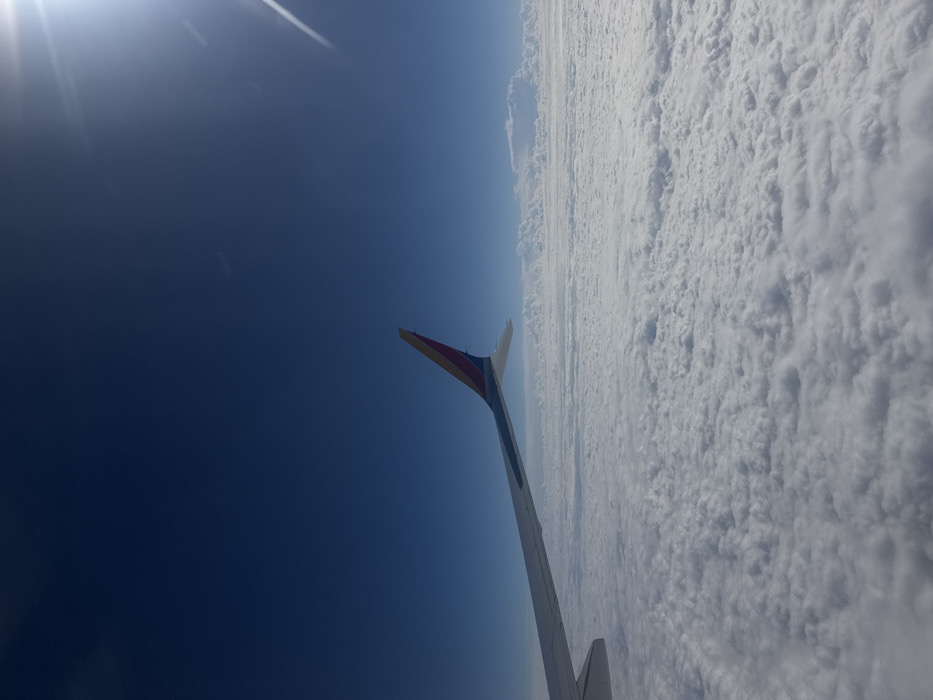 An airplane wing extends into a clear blue sky, capped with a red and yellow tip. The view from the airplane window features a vast sea of fluffy white clouds stretching to the horizon. The sun is bright. The perspective is from above, looking down at the cloud cover.
