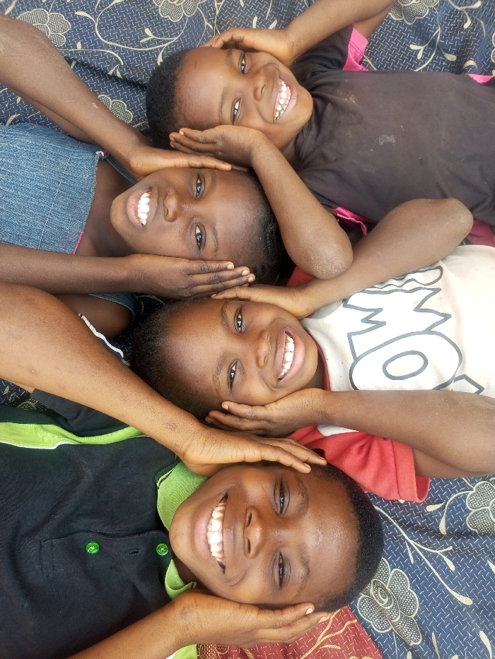 Four individuals, appearing to be children or young adolescents, are arranged horizontally, lying on their backs with their heads oriented towards the camera. The scene takes place in the city of Tempure, Nigeria. The individuals are stacked, with each person's head resting near the torso of the one above them. Each individual smiles broadly at the camera, displaying their teeth. Their hands are placed on either side of the head of the person below them in the stack, forming a continuous chain of contact. From top to bottom: 1. A person wearing a denim top, with hands placed on the head of the next individual. 2. A person wearing a black short-sleeved t-shirt, with hands placed on the head of the next individual. 3. A person wearing a light-colored (possibly off-white) short-sleeved t-shirt with a dark graphic design on the chest, with hands placed on the head of the next individual. 4. A person wearing a black short-sleeved polo shirt with a light green collar, sleeve trim, and green buttons on the placket, with hands placed on either side of their own head or the head of an unseen individual below. The individuals are positioned on a patterned fabric surface. The upper portion of the background consists of a dark blue or black fabric with a lighter, intricate floral or geometric pattern. The lower portion features a red fabric with a gold or yellow patterned design. The lighting is even, illuminating all subjects without harsh shadows.