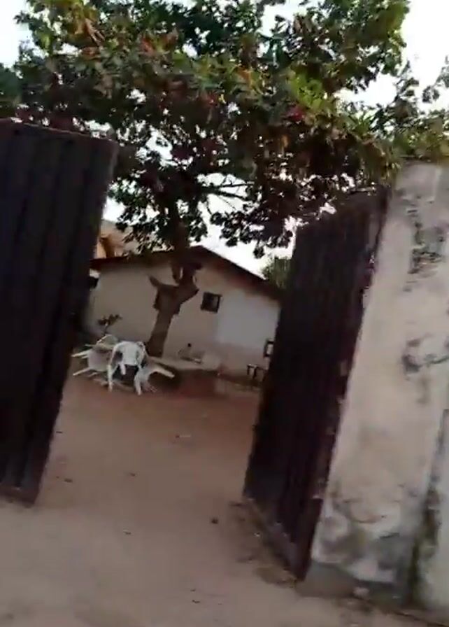 A person is walking on a sandy, dusty ground near a wall and a brown metal gate. Trees are visible behind the wall. The camera is shaky and points down at the ground. The person's shoes are partially visible as they walk. In the background, there is a small gathering of people sitting at tables. The overall environment seems to be a somewhat unkempt outdoor area.