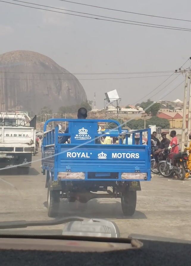 view from a moving vehicle in what appears to be a developing country, possibly Africa, based on the vehicles, landscape, and architecture. In the foreground, a blue "Royal Motors" branded tricycle is visible, moving in the same direction. To the left, there is a white truck with text that appears to read "MITSU BISHIA." In the background, a large rock formation or hill dominates the horizon. A line of motorcycles and a maroon car are stopped along the side of the road. A few people are visible standing around the motorcycles. The sky is hazy, and utility poles with power lines can be seen along the roadside.