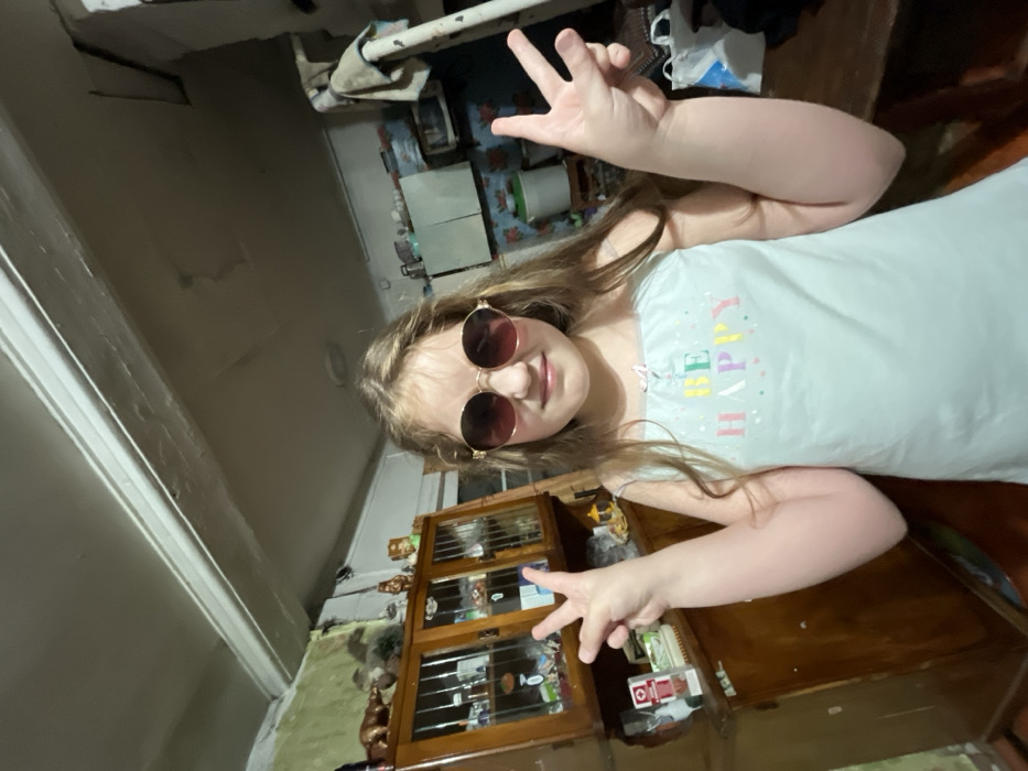 A young female, approximately 6-10 years old, with long brown hair, is depicted indoors, likely in a residence in Зипуново, Russia. She wears large, round, gold-framed sunglasses with dark lenses and a light blue spaghetti strap top featuring "BE HAPPY" in colorful letters on the chest. She is smiling subtly towards the camera. Both her left and right hands are raised to chest height, forming peace signs (V-gestures) with her fingers. The background to the left shows a wooden display cabinet with glass doors containing various items, with decorative figurines on top. The wall behind is a faded green. To the right, a kitchen or utility area is visible, including a light-colored countertop, a white microwave oven, and wall sections with patterned wallpaper. A pipe or vertical structure with a towel draped over it is on the far right. The ceiling is light-colored with visible beams and some irregularities. The lighting is dim, suggesting an indoor setting with artificial light.
