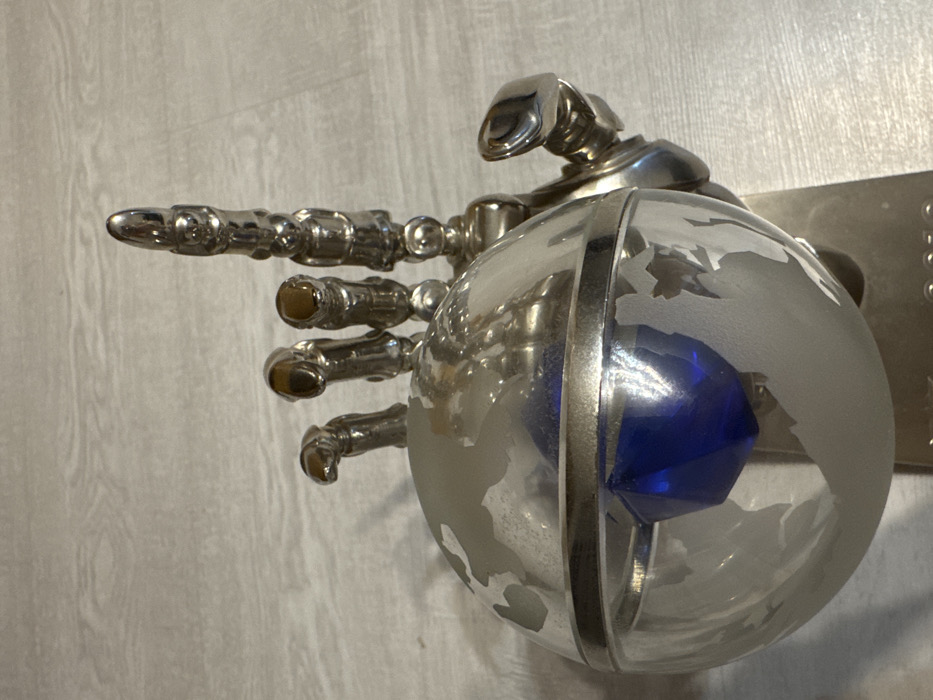 A polished chrome hand-shaped sculpture firmly grasps a clear glass globe with an etched map of the world